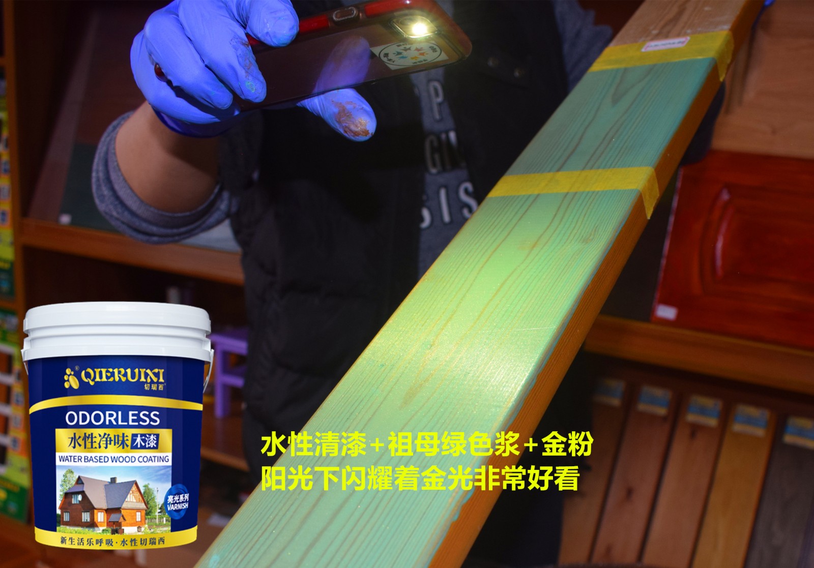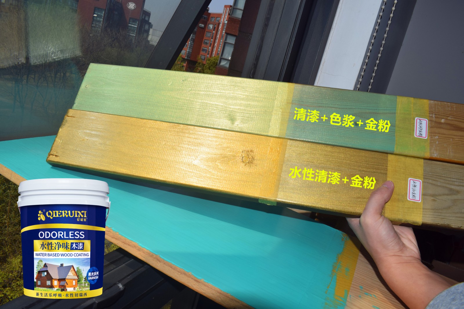 案例介紹:水性漆可以用純凈水稀釋,也可以加入適量的金粉進(jìn)行調(diào)色,做透金效果。水性漆調(diào)金粉時(shí)可以使用透明清漆調(diào),也可以加入水性色漿和金粉一起調(diào)。使用時(shí)只要充分?jǐn)嚢杓纯墒┕?,施工建議刷涂。